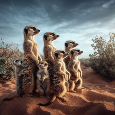 An AI generated illustration of meerkats standing in a sandy desert landscape