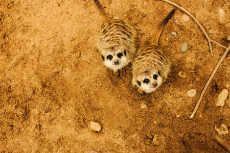 Two meerkats standing on the sand and looking at the camera