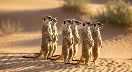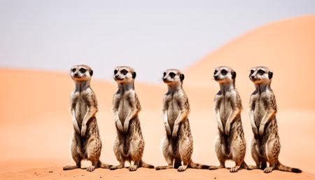 A quintet of vigilant meerkats stand at attention on a sandy desert backdrop, embodying communal vigilance.. AI Generation