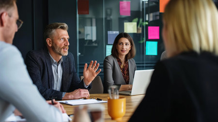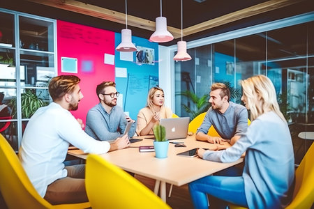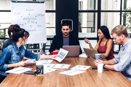 Group of business people discussing business plan at meeting in modern office. Businessman and businesswoman working together on project.