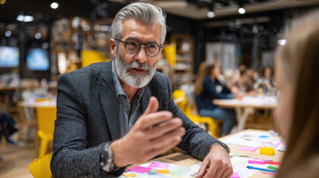 Engaged older man with gray hair and beard discussing ideas in creative workspace, surrounded by colorful notes and collaborative atmosphere