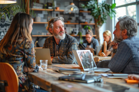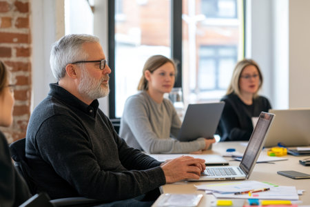 A diverse group of professionals, including an older man with glasses, engaged in a business meeting in a modern office with laptops and documents.