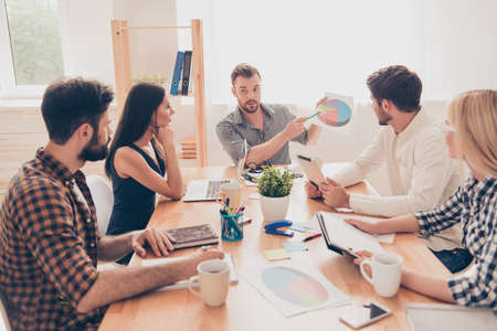 Brainstorm. Group of young business professionals having a meeting. Diverse group of coworkers discuss new decisions, plans, results, strategy. Creativity, workplace, business, finance, teamwork.