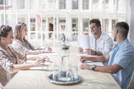 A friendly atmosphere in the office. Young, confident employees of the multiracial team discuss tasks and laugh at the morning meeting