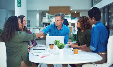 Business meeting in a modern office space with professionals discussing strategies and building connections during a handshake