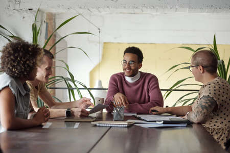 Group of young successful economists in casualwear sitting by table in office and discussing plans and ideas for new project