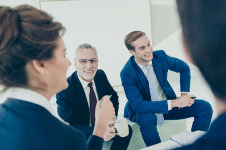 Beautiful business people are using gadgets, talking and smiling during the conference in office