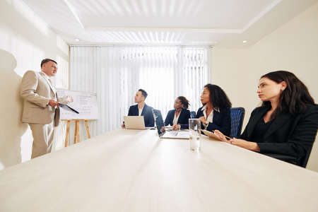 Mature company owner talking in front of his top managers and explaining new strategy