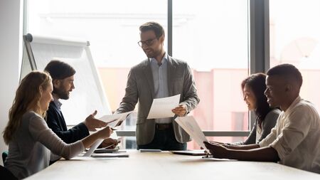 Confident businessman manager giving documents to colleague, smiling employee wearing glasses presenting financial report, work result or new project plan to team at corporate meeting in boardroom