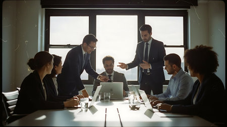 Diverse business people gather in a modern meeting room to discuss and brainstorm business ideas