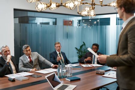 Business experts working together. Young businessman holding a financial report and explaining something to multicultural business team while having a meeting