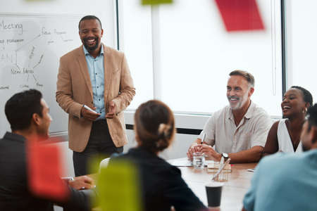 A confident Black man stands at the head of a long table, addressing a group of engaged colleagues in a bright, modern conference room. The atmosphere is vibrant and collaborative, showcasing a mix of emotions as team members share ideas and insights.
