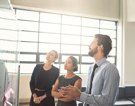 Im liking what I see here. a group of businesspeople looking over plans on a whiteboard.