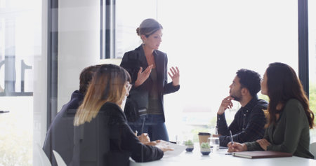 Wide shot of multiethnic business team talking at meeting table in office conference room, brainstorming in co-working space with large window. Project leader woman talking to colleagues. ai generated