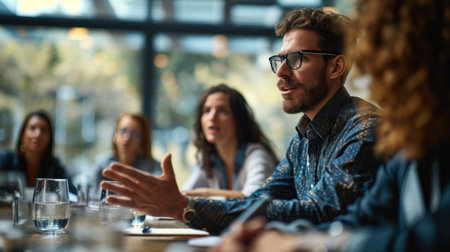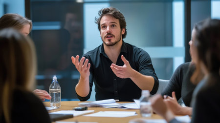 A business leader conducts a meeting with a focused group, fostering teamwork and collaboration while discussing important strategies in a professional environment.