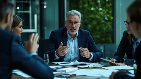 A confident senior executive stands at the head of the boardroom table, leading a strategic meeting with the corporate team. AIG41
