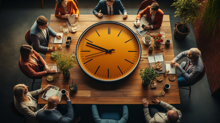 A group of men in suits face a prominent clock while engaged in a serious discussion about time management.