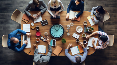 Top view of business diverse people and meeting team at desk, Aerial view of header or banner businessman and businesswoman sitting around a conference table