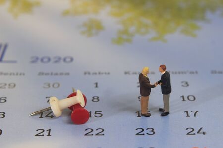Simple Illustration Photo, Two Man Handshaking, Business Agreement at Calendar beside red and white push pin