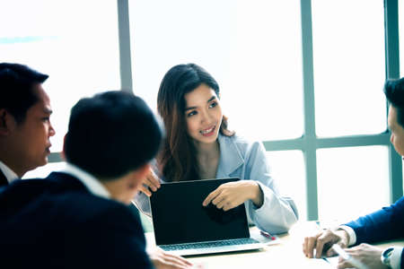 Asian business woman explain strategy plan with digital laptop in conference room.