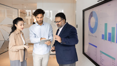 Diverse businesspeople engaged in focused discussion using digital tablet stand in modern office next to large screen displaying charts. Strategizing, performance analysis, new business AI app review