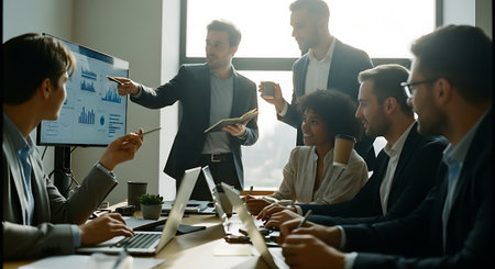 Group of business people discussing the charts and graphs showing the results of their successful teamwork, Generative AI illustrations.