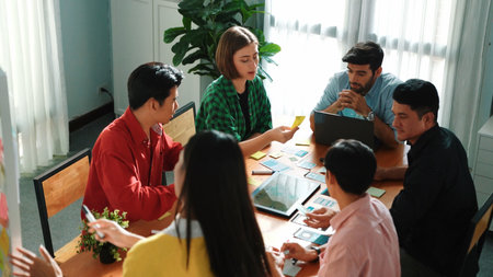 Diverse group of office worker and employee applauding, happy collaborate on strategic business marketing planning. Teamwork and positive attitude create productive and supportive in ornamented office