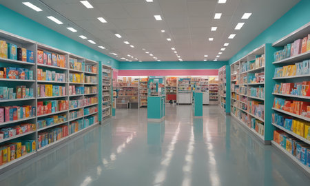 Interior of a modern drugstore with shelves and rows of books