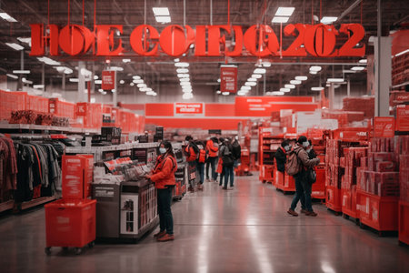 An interior shot captures a modern retail store with numerous shoppers. The scene features rows of shelves filled with products, illuminated by bright overhead lighting. The composition highlights a clean, minimalist style with a focus on product displays. This image could be suitable for commercial use in advertising or editorial content about retail.
