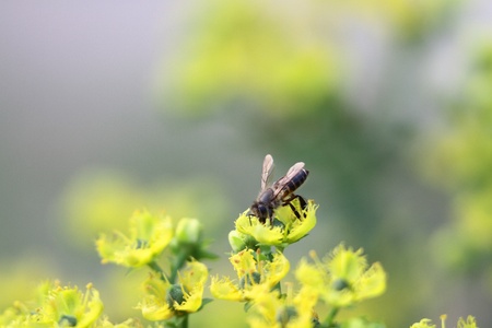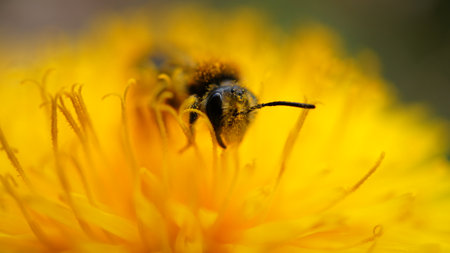 Honey bee collecting pollen in a dandelion flower. Yellow flowers. Insect at work. Photo from nature
