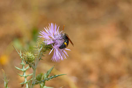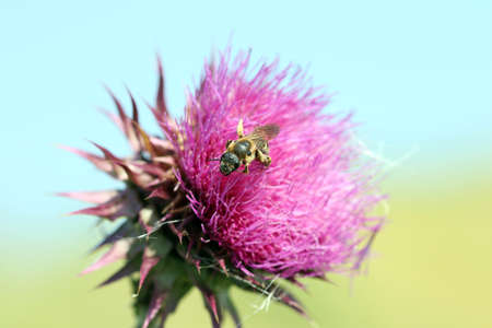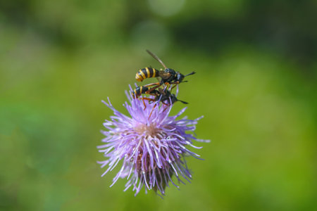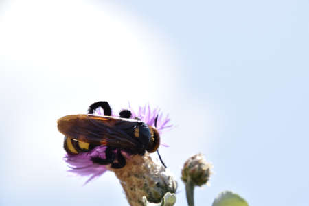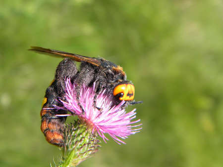wasp, bee (Scolia hirta) feeding on wild thistle flower