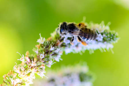 a large dangerous bee extracts nectar from the flowers of the plant peppermint