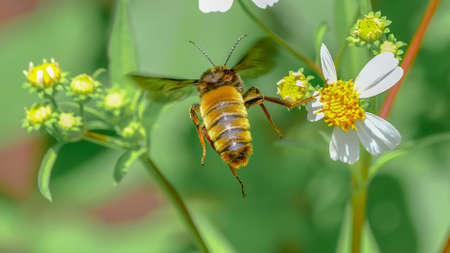 detail of honeybee - Apis Mellifera -european or western honey bee in flight flying away from Spanish needle bloom - Biden’s Alba showing blurred wings beating, pollinating