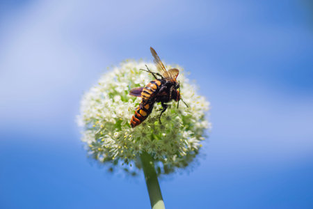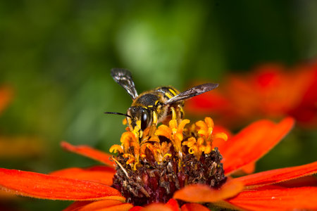 Red-banded wasp collecting nectar from a wild blossom in the meadow.