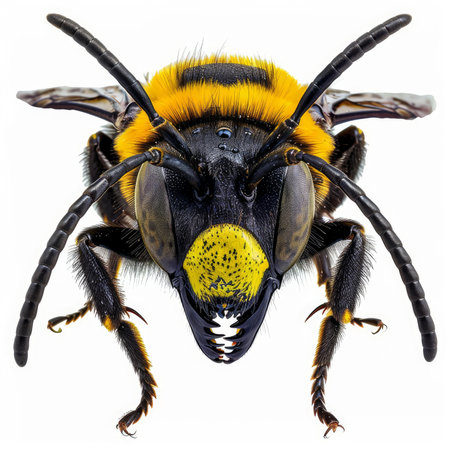 A sharp close-up of a worker bee, showing its intricate details and texture on a white background