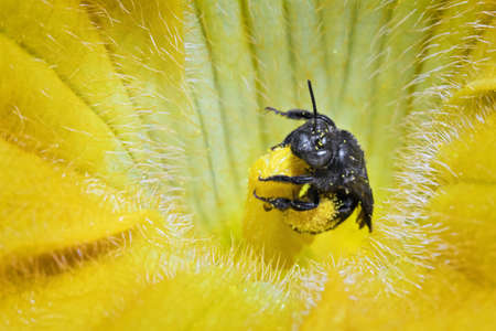 Macro view of a busy bee covered in golden pollen foraging on a vibrant yellow flower