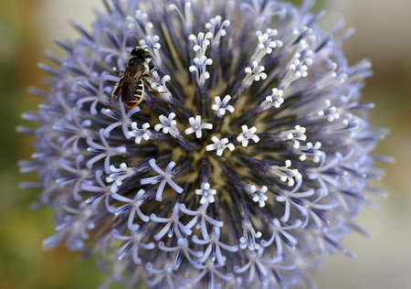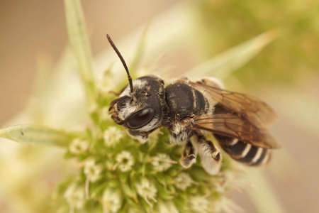Closeup on a female Variable miner, Andrena variabilis sittin on the green Eryngo flower, Eryngium campestre in Southern France