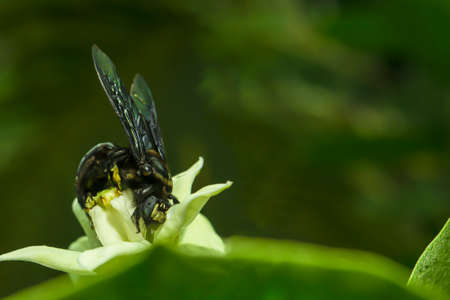 Macro shot of a bee while eating on flower with pollen on body. Green blurry background day shot