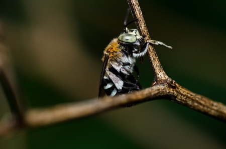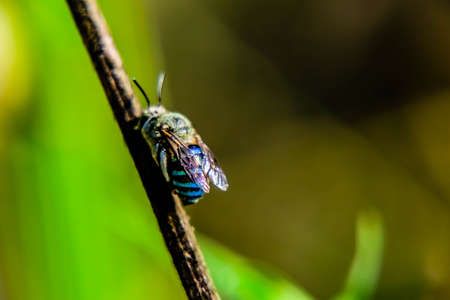 Close up shot of a blue colored bee on a branch with defocused background and copy space