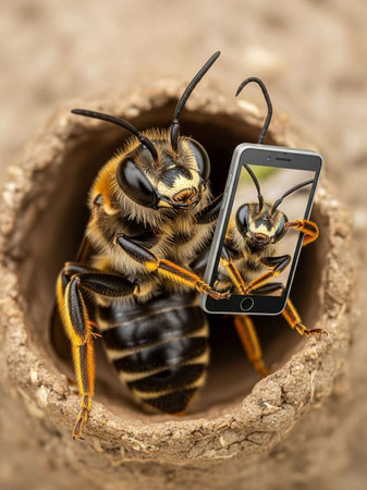 An AI generated illustration of a bee, with its yellow and black striped body, round eyes