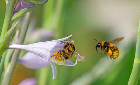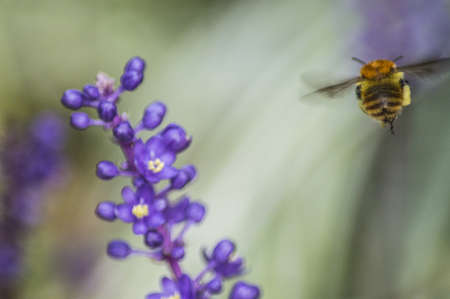 Blue bumblebee flies by the inflorescence of the black-hens in the botanical garden. The flower is very rich and bright. Pollination of flowers is the purpose of a bumblebee.