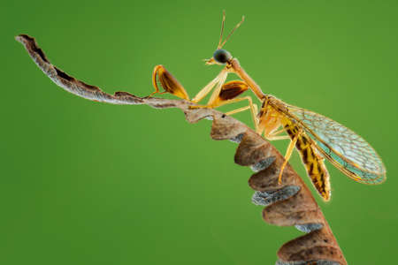 Mantis Fly on the twigs green background