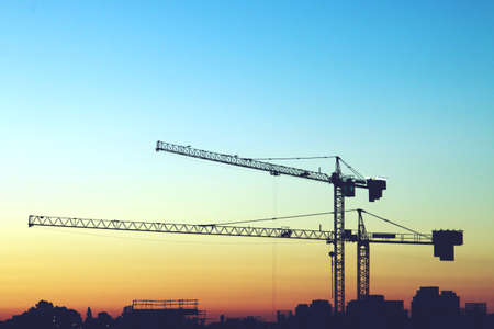 Silhouette of construction cranes over new construction landmark buildings at sunset. Urban background
