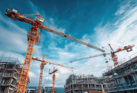 Several construction cranes are prominently displayed against a vibrant blue sky. The scene features buildings under construction with visible frameworks. The composition is likely an outdoor setting, possibly during the daytime, with bright natural lighting. Suitable for use in projects related to construction, development, or urban planning.