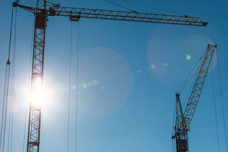 construction cranes against the blue sky in the back rays of the sun