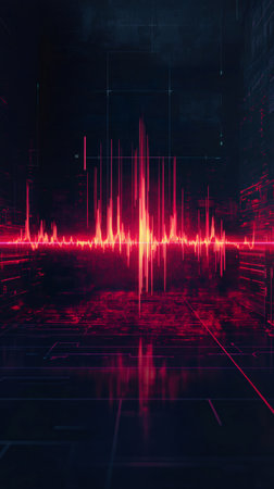 A dynamic, glowing red sound waveform pulsates vertically against a dark background, with a subtle digital circuit pattern visible at the base.