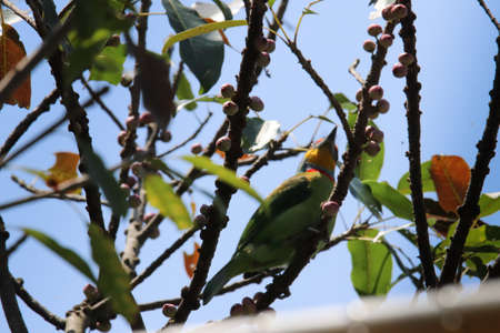beautiful moustached barbet Megalaima incognita in fruiting tree