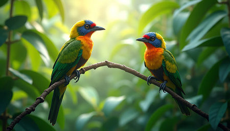 Two vibrantly colored birds sit peacefully on a branch surrounded by lush greenery Ideal for nature lovers and bird watching themes.