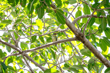 Crimson-fronted barbet (Psilopogon rubricapillus) bird, perfect camouflage with the banyan tree leaves.