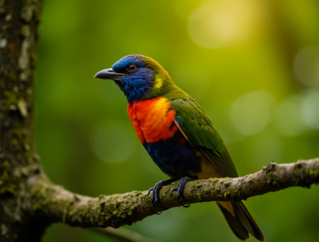 A close-up of a beautiful bird with vibrant plumage, perched on a tree branch in a lush forest.